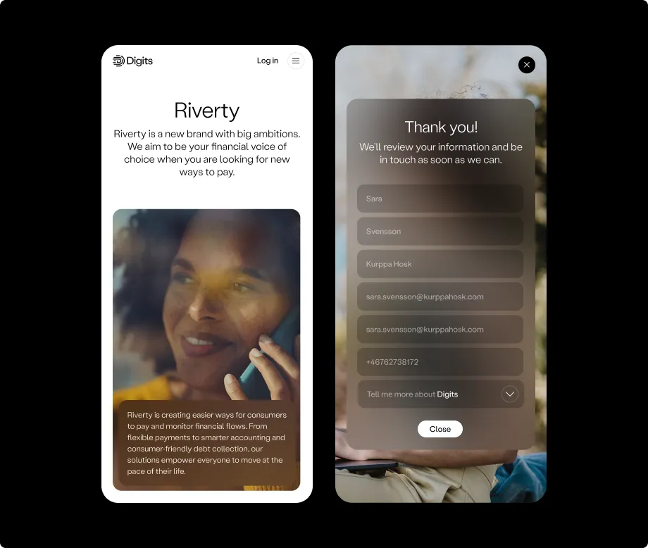 Setting to the tone for the Digits brand as a whole we defined the visual expression both for the marketing website as well as the AI product. Different tools in the visual toolbox were given a distinct purpose within the bigger visual expression. As a whole, the marketing website need to build trust in the product, but also be relatable in order to be appealing and desirable. Additionally, it needs to be decluttered and feel simplified and efficient.